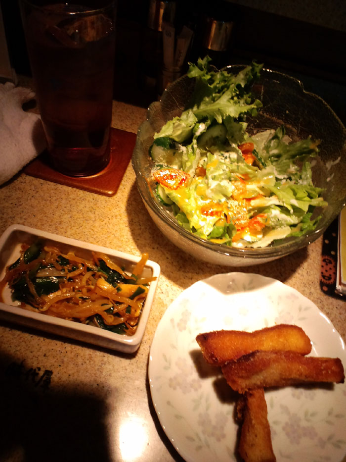 今日はサラダを頼んで、昨日の餃子を頼んで、後のメインを頼み損ねていると、サービスの揚げパンをママが持ってきてくれた!うれしい!